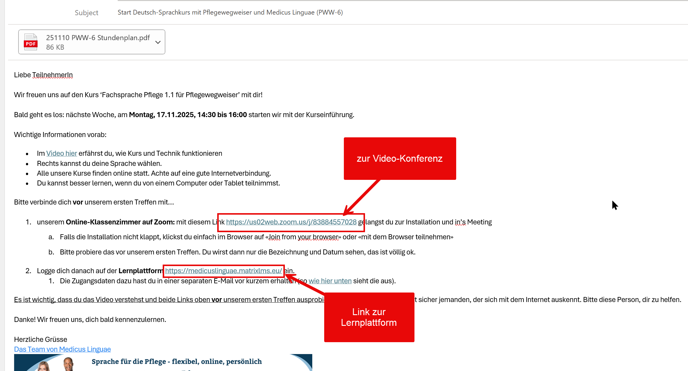 Eine solche Email erhältst du einige Tage vor der Einführungsveranstaltung. Sie enthält die Links für beide Systeme.